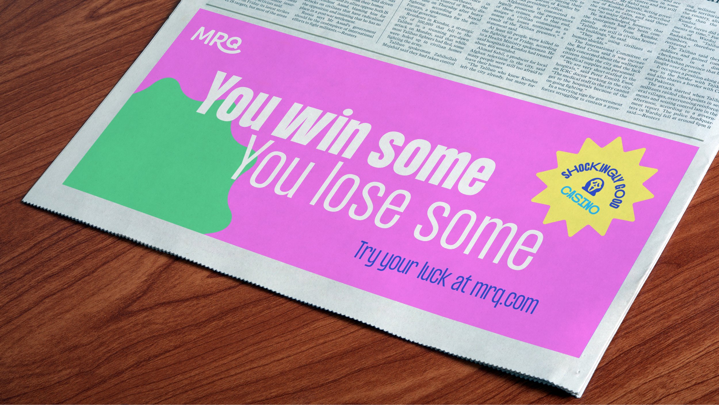 The message “You win some. You lose some” was considered a controversial approach for a brand in their category. It spoke directly to their target audience - the realist players - and became a war cry for MrQ that helped establish them as the honest, no BS casino that says it how it is. Most importantly it got people talking. The tagline was used in their TV campaigns ever since.